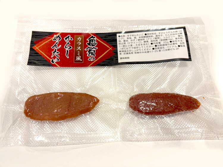九州名物「からしめんたい」を日本の三大珍味のひとつ、「カラスミ」風に仕上げました。